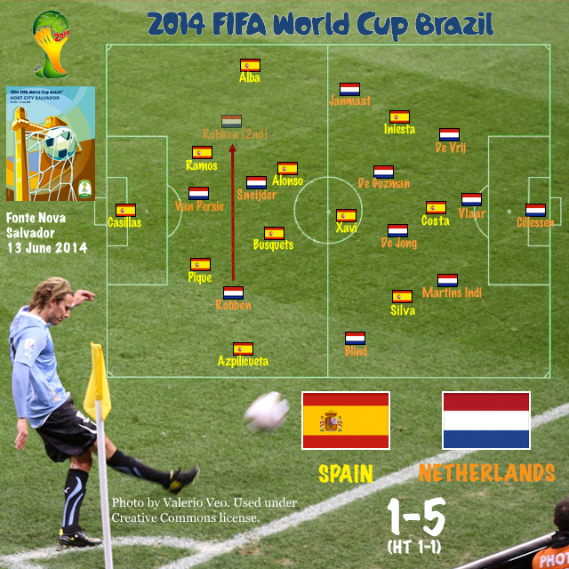 Spain used the same 4-2-3-1 they have used for the past five years (their supposed 4-6-0 merely expressed disapproval at using a player classified as a midfielder rather than a striker in the top spot). Diego Costa, though new to Spain–literally, given his that his junior football was played for his birth nation, Brazil–was expected to start up top. Chelsea’s César Azpilicueta edged out Juanfran at right back despite the latter’s reported return to full fitness. Following the Netherlands’ go-ahead goal, Spain shifted to a 4-3-3 with Andrés Iniesta moving inside and Pedro Rodríguez, replacing Xabi Alonso, moving to the flank. While that change probably can’t be blamed for the immediately following set piece goal, it’s pretty clear that the shift gave up more in defense than it gained in attacking verve.