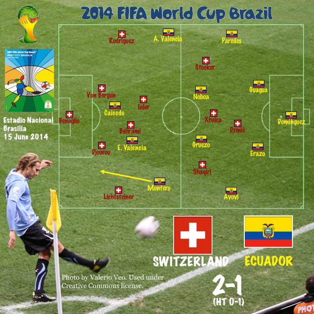 Another player to consider is Michael Arroyo, who replaced Felipe Caicedo and played behind Enner Valencia. Because he was unable to finish off the last minute chance created by Antonio Valencia, allowing Behrami to come away with the ball and start Switzerland’s game-winning attack, he will likely have a difficult time entering the starting XI at this point. Michael Cox, however, noted his second half performance against England in a pre-Cup friendly, operating in the center of a 4-2-3-1, as a potential way for Ecuador to bolster their midfield control. Perhaps a strong second half performance against Honduras, should Arroyo get the opportunity, would clear the way for a larger role against France, where midfield possession will be even more at issue.