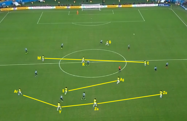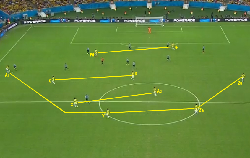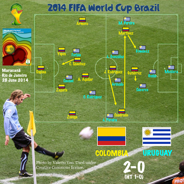 Other than Colombia’s two fantastic goals, formations were actually one of the more interesting elements of the game. Uruguay set out in a 3-5-2, as they had against Italy. Diego Forlán replaced the banned Luis Suárez and Maxi Pereira came in at right wing-back, Álvaro González moving inside for the substituted Nicolás Lodeiro. As had been the case with Suárez, Cavani and Forlán exchanged the role of dropping off into the midfield, though Forlán did so more frequently. The other notable aspect of this shape was the high positioning of Cristian Rodríguez, which sometimes made it seem more like a 3-4-3. Chasing the game in the second half, manager Óscar Tábarez shifted to a 4-3-1-2, replacing a tiring (or at any rate elderly) Diego Forlán with Christhian Stuani and introducing Southampton’s Gastón Ramírez to play behind the strikers. With Álvaro Pereira coming off, Cáceres now operated on the left flank, and Cristian Rodríguez dropped back into a more conventional role within a midfield three (or diamond, depending on how you want to describe Ramírez’s role behind the strikers). Just under 15′ later, Uruguay shifted to a 4-3-3, with Abel Fernández replacing Álvaro González and joining the attack on the left, through frequently interchanging with Cavani in the middle. This formation, combined with Colombia’s more defensive posture, allowed for Maxi Pereira’s 74′ breakaway into the box and Cavani’s 84′ chance.