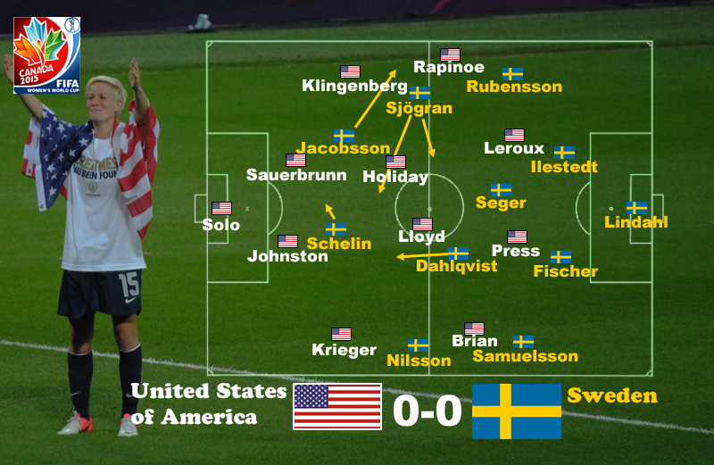 Sweden opened the game in a 4-4-2, with Sjögran playing wide on defense but tucking inside to help her team gain a numerical advantage in midfield. Inside, Lisa Dahlqvist usually marked Lloyd, while Seger tended to drop off and provide additional support against Press. As the United States continued to attack primarily down the right, however, Sjögran moved permanently into the middle. By 15′, Linda Jacobsson shifted to the right and Sweden were in a 4-2-3-1 for the majority of the half.