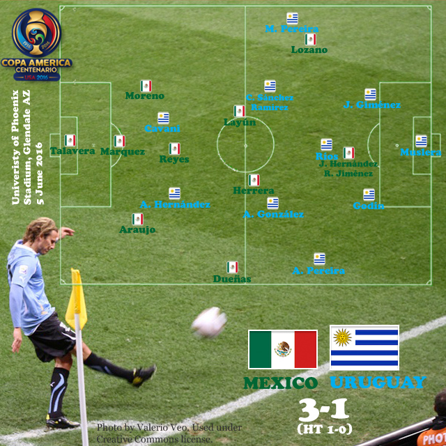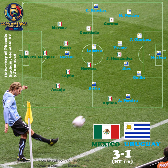 Playing without the injured Luis Suárez, Uruguay manager Óscar Tabárez opted for a 4-2-3-1 that left his other striker, Edinson Cavani, largely isolated from the rest of the team while Mexico controlled the game and tested the Uruguayan defense and keeper Fernando Muslera. An excellent cross by Guardado into space opened up by an intelligent run from Javier “Chicharito” Hernández led to the fastest own goal in Copa America history (4′). Cavani did have a good chance one-on-one at 30′, but Alfredo Talavera saved it. When defensive midfielder Matías Vecino was justly sent off for a 2nd yellow immediately before halftime, Uruguay’s fate seemed sealed.