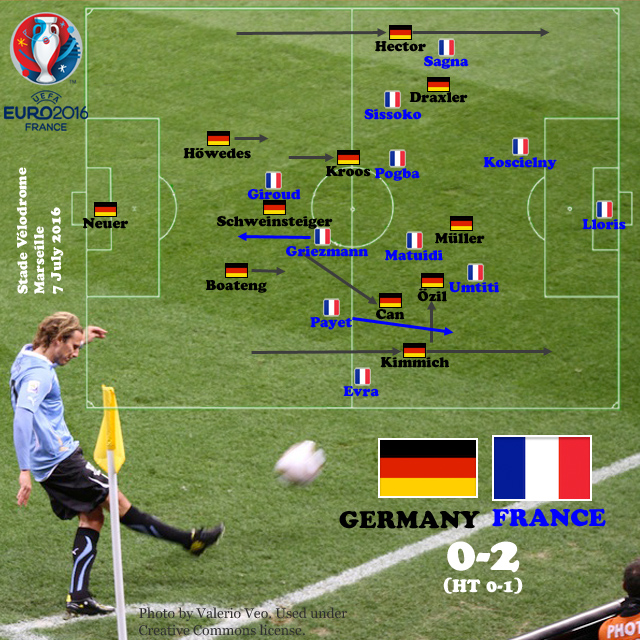France were unchanged from their last game against Iceland, Moussa Sissoko and Samuel Umtiti remaining in the starting XI despite the availability of N’Golo Kante and Adil Rami, Griezmann continuing in the middle underneath Olivier Giroud. Germany’s manager Joachim Löw faced more difficult selection problems, with Mario Gomez and Sami Khedira injured and Mats Hummels suspended. Returning to a back four allowed Benedikt Höwedes to partner with Jérôme Boateng in place of Hummels, and Bastian Schweinsteiger’s unexpected availability helped to allay the shortfall in midfield. Recognizing Schweinsteiger’s fitness was an issue, Löw added tournament debutant Emre Can to a 4-3-3 midfield. That left Thomas Müller to replace Gomez up top, with Julian Draxler coming in on the left and Mesut Özil shifting over to the right.