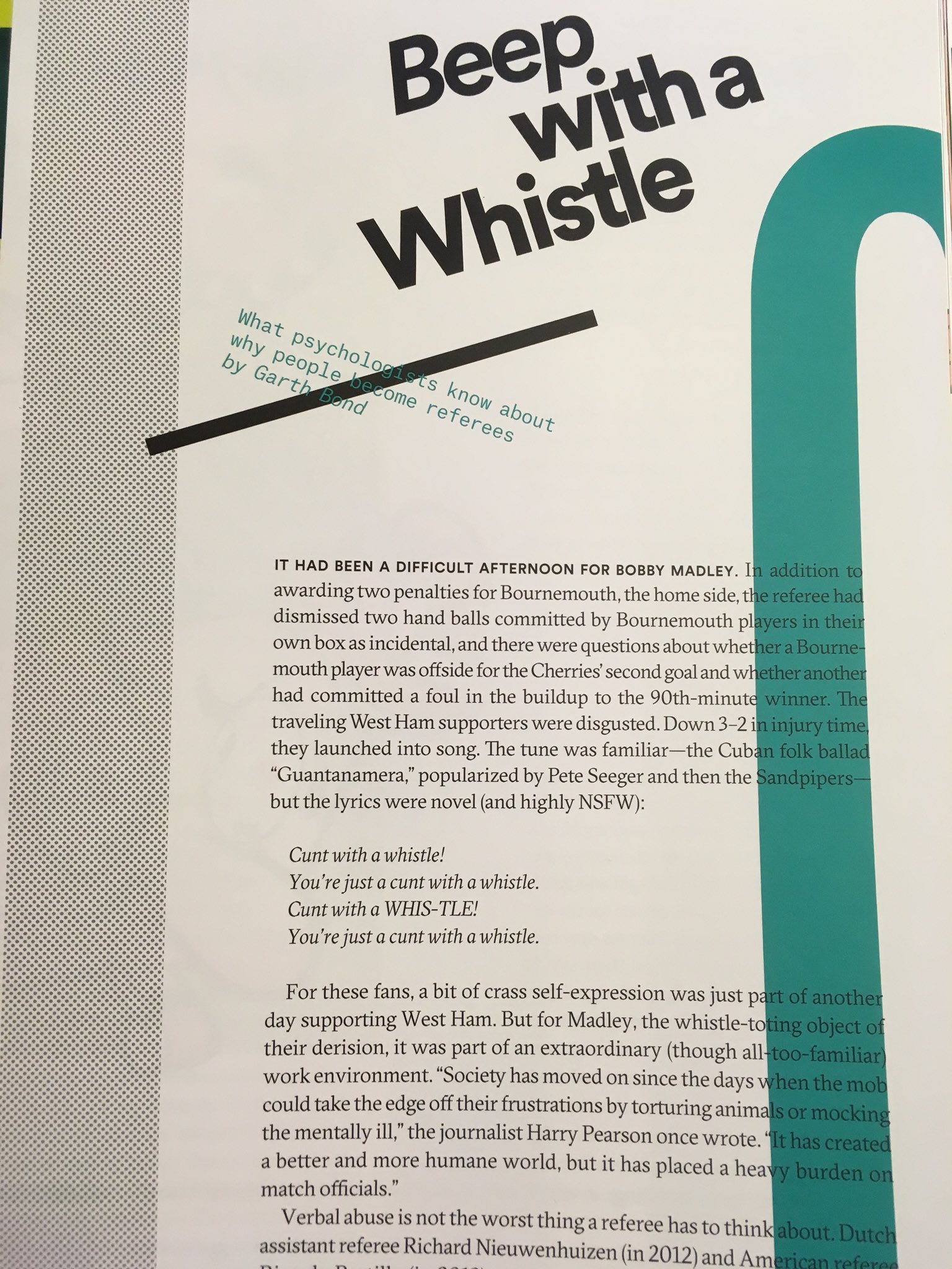 The controversial penalty calls in France-Norway and Australia-Brazil over the past few days are as good an excuse as any to shamelessly promote an article I wrote about a year ago for Howler Magazine. Issue 14 had a section devoted to referees, and I wrote a piece about what recent research tells us about the psychology of referees. Then-editor George Quraishi even interviewed me on the Howler podcast, Dummy. You can listen to me talking about my findings by clicking on the podcast link below.